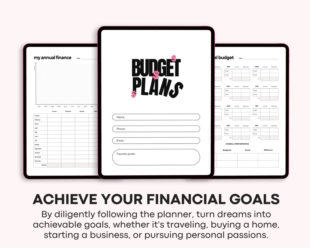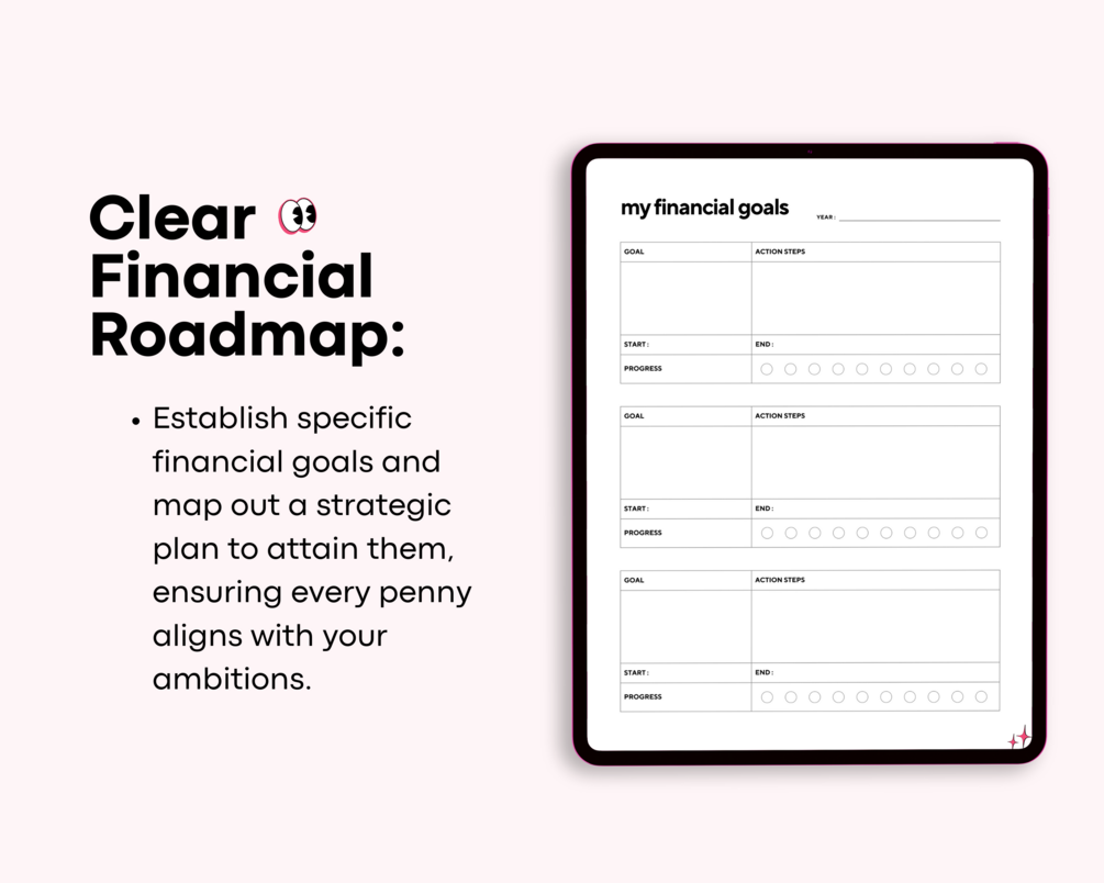 - Financial Roadmap: Plan your financial journey with purpose using dedicated pages for goal-setting, vision boards, and an overview of your financial landscape.