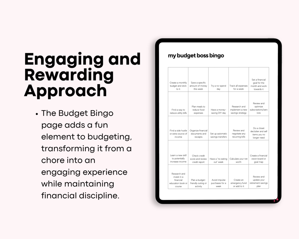 - Engaging Tools: Make budgeting enjoyable with interactive elements like the Budget Bingo page, making your financial journey rewarding and motivating.