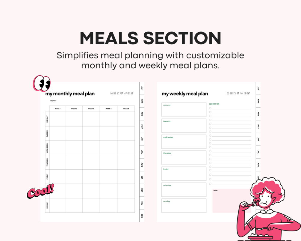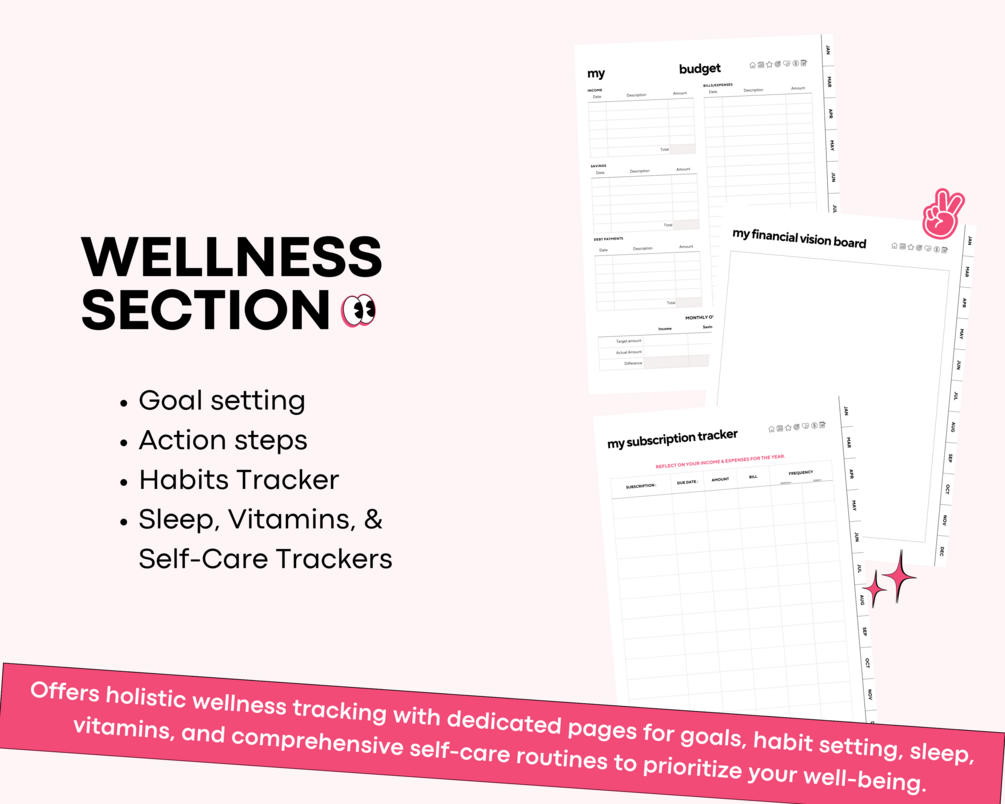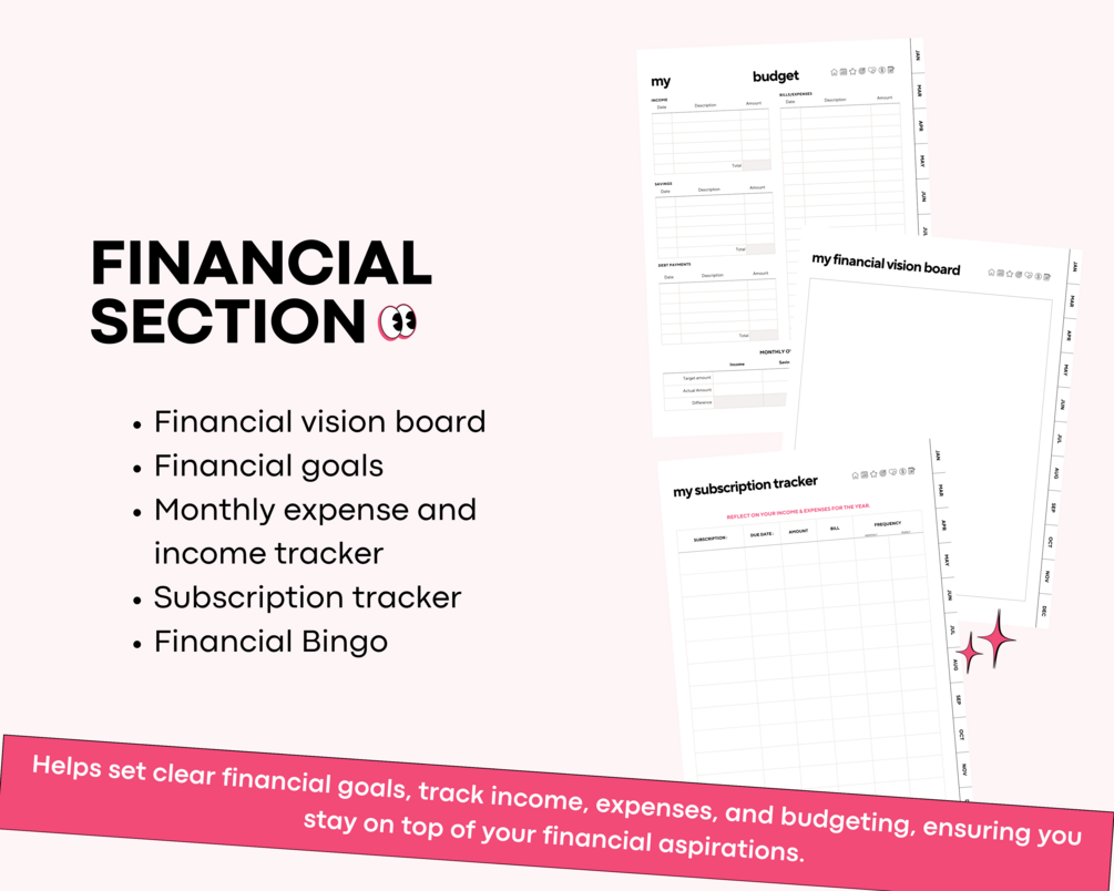 - Smart Budgeting: Track income, expenses, and monthly budgets with precision using dedicated trackers and bingo-styled planners.