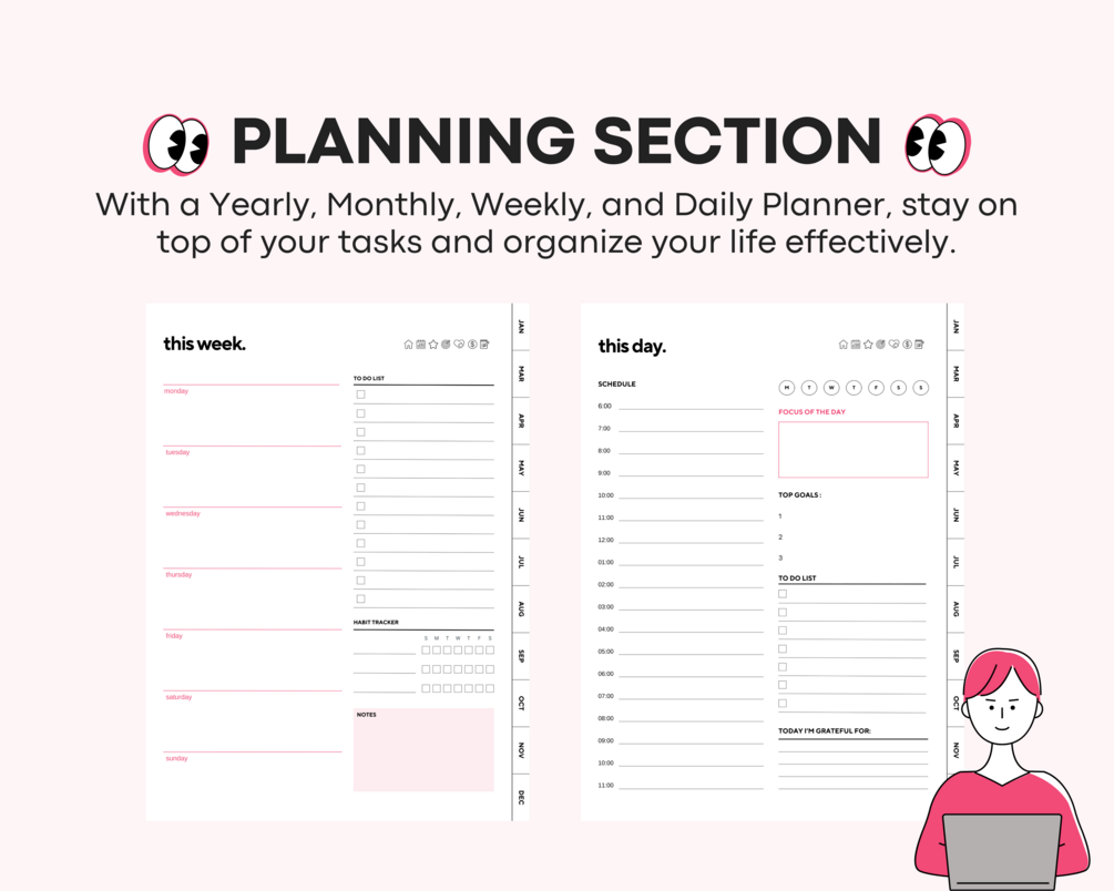 - Yearly, Monthly, Weekly, Daily Planning: Effortlessly plan every aspect of your life with dedicated sections for detailed scheduling and organization.
